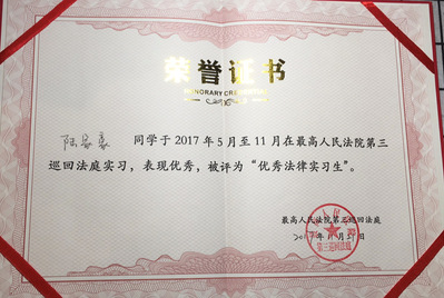 我校研究生获最高院第三巡回法庭“优秀法律实习生”称号