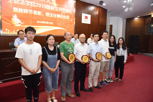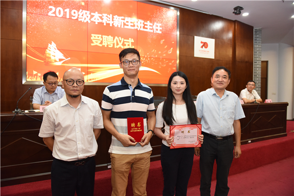 随后,周书记宣读了2019年度受各类表彰教师名单,并宣读了2019级本科新生班主任聘任决定,担任本科新生班主任的老师是:卢然、蔡仙、石肖雪、邵聪,方新军院长和周国华书记共同为新生班主任颁发聘书。