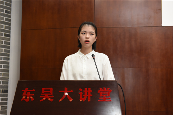 2019级法学专业吴翊文同学作为本科新生代表发言,她表示会努力学习,不辜负自己的大学生活,并希望大家可以在法学院开始自己新的征程。