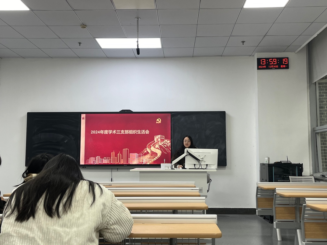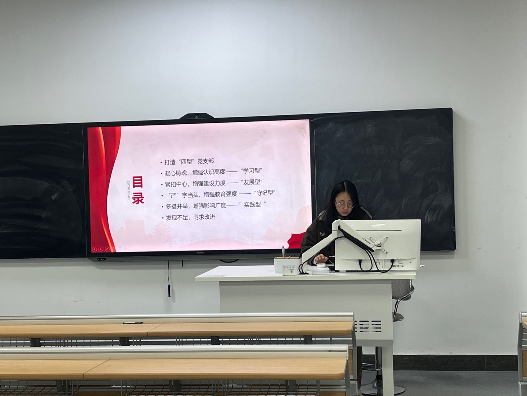 会议伊始,由栗嘉曼同志代表支委会向支部全体党员述职。栗嘉曼同志围绕增强“高度”、“力度”、“强度”、“广度”四个维度,打造“学习型”“发展型”“守纪型”“实践型”党支部四个方面报告了2024年度支部制度建设、组织建设的相关工作及取得的成绩。第一,凝心铸魂 ,增强认识的政治高度,打造“学习型”党支部。在这一年的工作中,支部始终坚持把思想政治建设摆在首位,增强支部思想教育引领力,一年来,“三会一课”制度运行有序,一年组织开展党员大会和党课4次、党支部委员会和党日活动12次,开展“党的二十大精神解读”、“党的二十届三中全会报告解读”、“学习《习近平关于全面加强党的纪律建设论述摘编》”等专题集体学习活动5次。第二,紧扣中心工作,增强党支部的建设力度,打造“发展型”党支部。支部严格按照“坚持标准、保证质量、慎重发展”的原则,认真做好党员发展工作。本年度共培养入党积极分子12名,发展预备党员4名,预备党员转正2名。支部不断完善入党积极分子培养考核体系,以“积分”方式进行管理。第三,“严”字当头,增强党纪学习教育强度,打造“守纪型”党支部。党纪学习教育开展以来,支部高度重视推动深入学习习近平总书记关于党纪学习教育的重要讲话和重要指示精神。(四)多措并举,增强党的影响广度,打造“实践型”党支部。党支部将入党积极分子参与社会实践活动和志愿服务活动作为培养考察的重点环节,引导支部的党员和积极分子积极投身于社会实践服务活动。