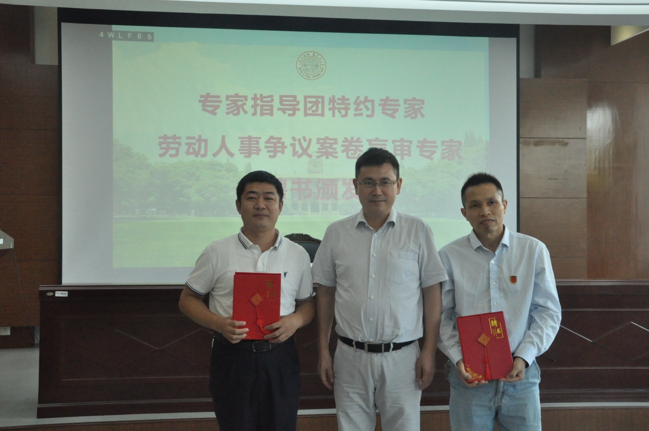 市人社局二级调研员吴友良为我院孙国平教授、丁建安副教授颁发专家指导团特约专家、劳动人事争议案卷盲审专家聘书。