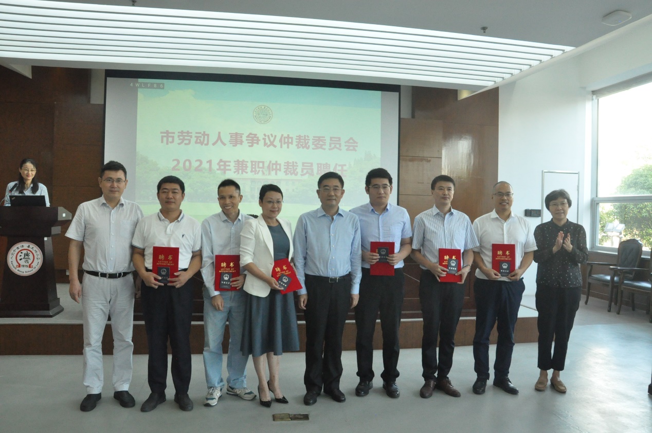 市人社局局长朱正、二级调研员吴友良、市总工会二级调研员高慧芹共同为2021年市劳动人事争议仲裁委员会新聘任兼职仲裁员颁发聘书和仲裁员证。