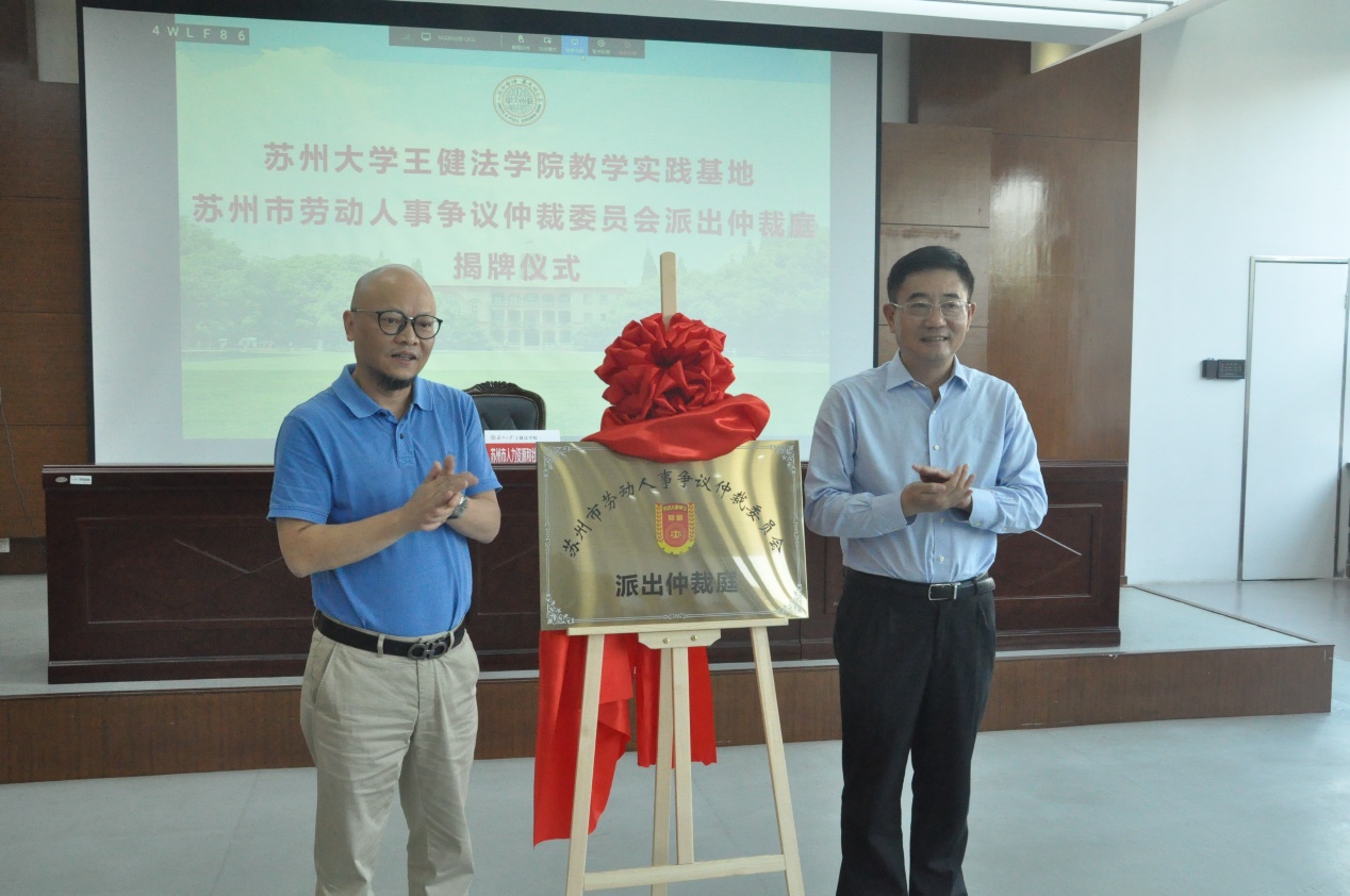 市人社局局长朱正、我院方新军院长共同为我院教学实践基地、苏州市劳动人事争议仲裁委员会派出仲裁庭揭牌。
