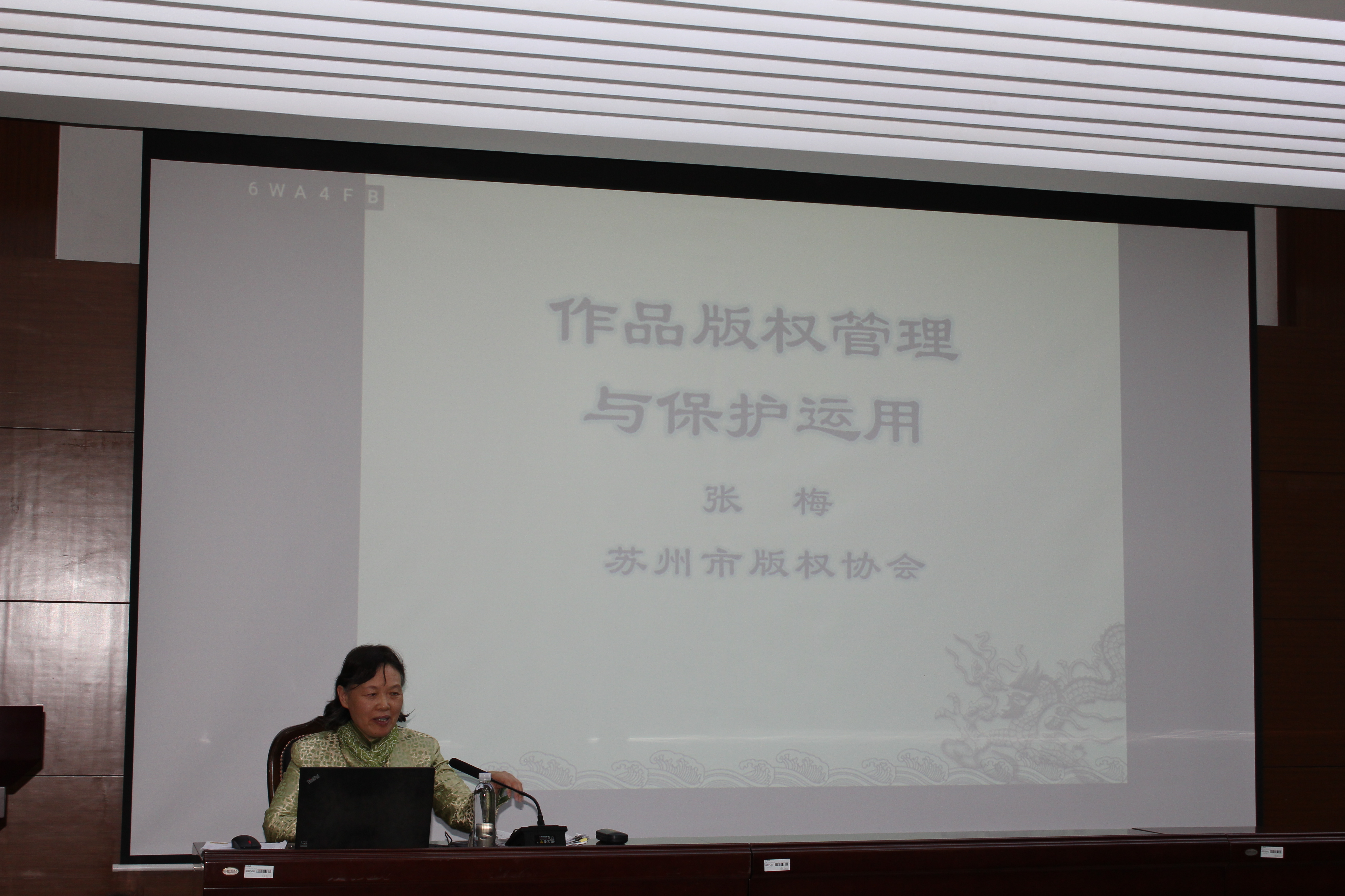 苏州市版权协会理事长张梅作题为《作品版权管理与保护应用》专题讲座。张梅理事长系统介绍了版权本质、版权产业和版权管理的相关内容,总结出版权管理中三个最重要因素,对著作权法中的若干规定作了详细解读。结合时事热点,以丰富的实践经验和生动有趣的版权案例,详细阐述了作品版权管理和作品版权保护意识的重要性,拉近了同学们与知识产权保护的距离,使同学们对我国版权管理现状和保护应用有了进一步的直观了解。