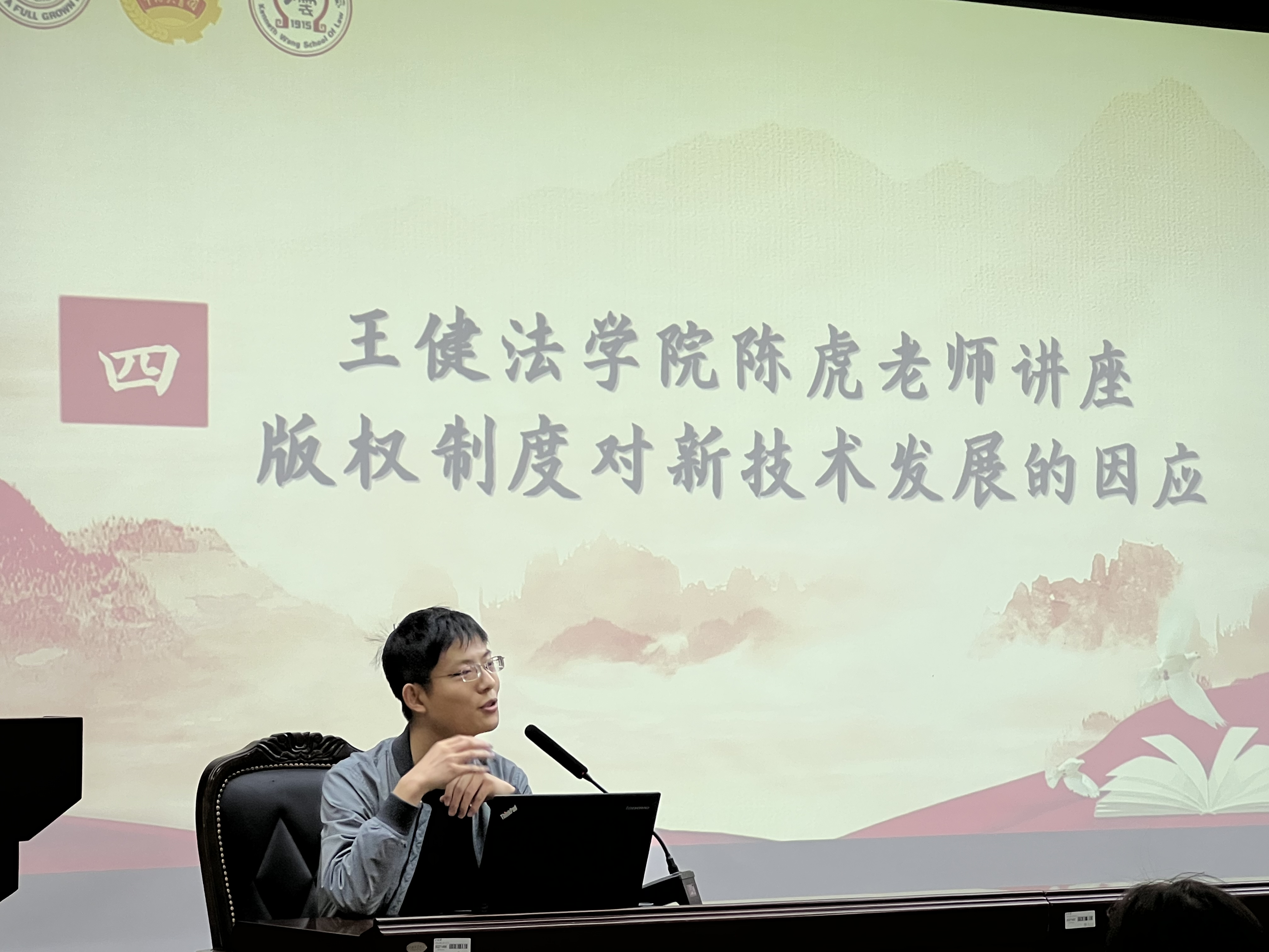 陈虎老师以《版权制度对新技术发展的因应》为题娓娓道来,陈老师立足现代新技术飞速发展的时代背景,通过分享他在日常生活中的观察发现,严谨分析了版权制度及知识产权制度与现代社会科技与信息飞速发展的内在关系,阐释了“人工智能的发展与应用对包括版权制度在内的知识产权制度是否具有冲击”这一前沿问题。
