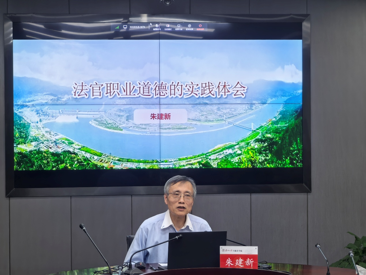 朱建新结合自身法官从业经历,向同学们阐述了何为法官职业道德,并提出法官职业道德的核心准则为:公正,廉洁,为民。他指出法官职业道德在实践中体现为四个方面,分别是:干一行爱一行;练就法官看家本领;坐得端、行得正、两袖清风一身正气以及维护法治权威。