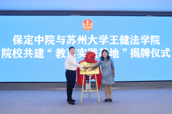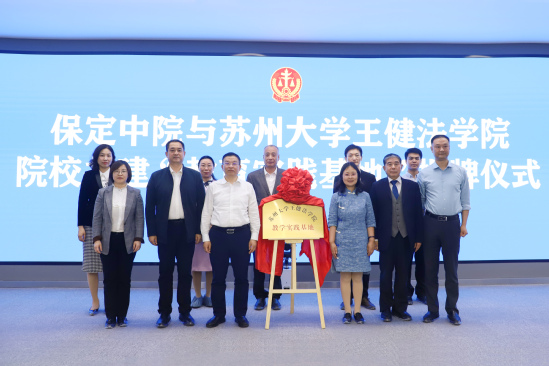5月9日下午,王健法学院与保定中院共同举行“苏州大学王健法学院教学实践基地”揭牌仪式。揭牌仪式上首先宣读了《苏州大学王健法学院 保定市中级人民法院战略合作框架协议》,保定中院党组书记、院长李建立与王健法学院党委书记孙宁华共同为苏州大学王健法学院教学实践基地揭牌并合影留念。保定中院党组成员、政治部主任阮喜伟,王健法学院副院长沈晔、刑法学教授李晓明出席揭牌仪式。李建立表示,双方要以此次揭牌仪式为契机,充分发挥各自优势,进一步加强合作交流,整合研究力量,凝聚各方智慧,推动理论研究和审判实务紧密结合,做到资源共享、优势互补、良性互动、共同发展,打造院校共建合作的“保定样板”。孙宁华介绍了王健法学院的发展历程、人才培养、师资力量等多方面的成果,并表示将选择优秀学生,以立足中国看世界的眼光在实践基地锻炼才干。期待双方进一步深化交流,未来的合作全面开花。