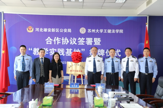 雄安新区是习近平总书记亲自决策、亲自部署、亲自推动的未来之城。作为“千年大计、国家大事”,雄安新区六年来的建设离不开雄安新区公安局在政治安全、社会稳定、百姓安居等方面的司法实践和创新探索。基于雄安新区公安局的特殊地位和突出贡献,王健法学院和雄安新区公安局通过多次协商沟通,确定了合作框架并于5月8日上午在雄安新区公安局举行了全面合作签约暨教学实践基地揭牌仪式。雄安新区公安局党委书记、局长姚爱国,局党委副书记、政委郑永丰,副局长刘立祥;王健法学院党委书记孙宁华、刑法学教授李晓明共同出席签约挂牌仪式。姚爱国表示,苏州大学王健法学院历史悠久,人才培养成果丰硕,有着很好的办学声誉;雄安新区公安局成立5年来,勇于探索、敢于担当,拥有一支能吃苦、敢冲锋的干警队伍,为守护雄安新区一方平安作出了贡献。双方的合作拥有共同的价值目标、契合的互补需求和深厚的感情基础。随着雄安新区建设和公安局业务的推进,院局双方一定会有越来越多的合作空间。孙宁华表示,雄安新区公安局作为王健法学院的教学实践基地,既有着和其他基地一样的教学实践共性,也有着雄安新区公安局司法实践的特殊性。对法学院学生来说,是一种全新的体验和学习,在增进业务能力的同时有利于培养学生的政治站位和人民情怀。双方的合作一定有着美好的未来。
