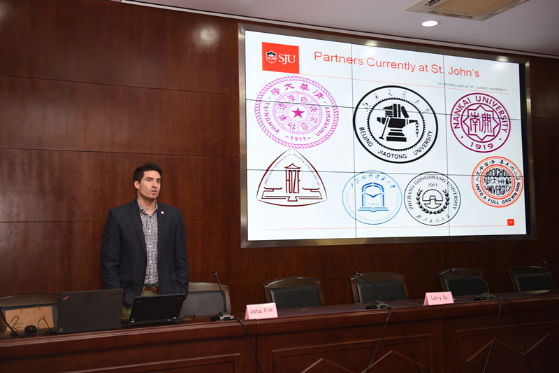 Joshua Alter教授首先为大家介绍了合作项目的概况,并讲解了该合作设立的目的以及当前的开展情况。通过该合作项目,我院合格学生可以在美国圣约翰大学法学院学习一年,获得圣约翰大学法学院法学硕士学位(LLM)。同时,在校期间学费也会得到减免。