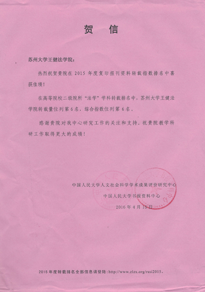 我院在2015年度复印报刊资料转载指数排名中喜获佳绩!在高等院校二级院所“法学”学科转载排名中,苏州大学王健法学院转载量位列第6名,综合指数位列第6名。