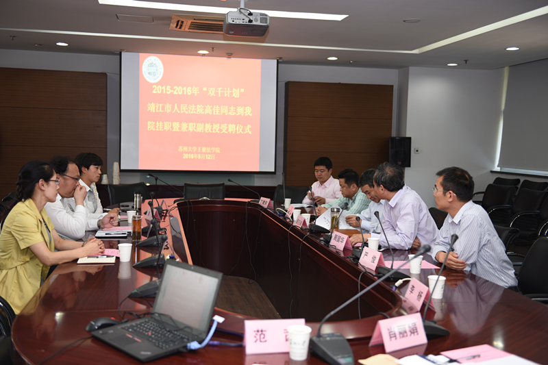 2016年5月12日下午,靖江市人民法院审判员高佳同志到我院挂职暨兼职副教授受聘仪式在我院二楼大会议室举行。靖江市人民法院院长陈卫兵、主任王新妹、副主任兰垒,王健法学院院长胡玉鸿、党委书记周国华、副院长方新军、党委副书记陆岸、副院长严俊、知识产权法副教授李杨、经济法副教授丁建安、办公室主任肖丽娟出席了受聘仪式。受聘仪式由周国华书记主持。