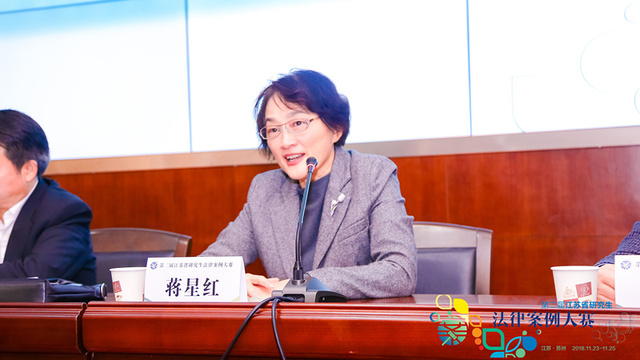 蒋星红代表苏州大学感谢省教育厅、省学位办对苏州大学的信任,同时也向参加本次比赛的各兄弟高校老师和同学表示欢迎和祝贺。她向与会人员介绍了苏州大学近年来的发展历程以及取得的成就, 并表示苏州大学会以法律案例大赛的举办为契机,创新研究生培养模式,强化研究生能力培养,为社会输送更多优秀的人才。