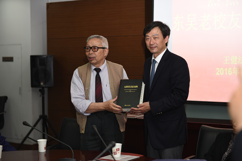 随后,校友代表向苏州大学捐赠了由东吴法学院校友、参加东京审判全过程且目前中国国内唯一健在的中国代表团成员高文彬题词的《远照英美法大辞典》、历年来老东吴校友会活动的一些资料、以及200本上海社科院出版的样书。
