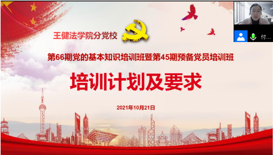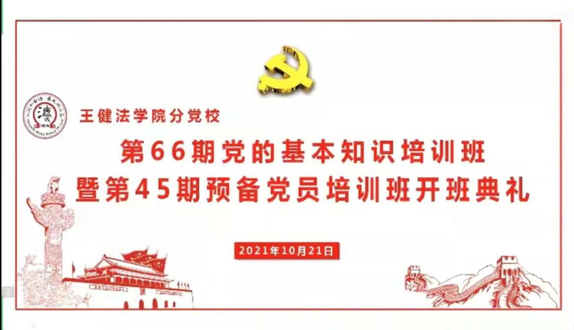 10月21日晚,王健法学院分党校第66期党的基本知识培训班暨第45期预备党员培训班开班典礼暨第一次党课在腾讯会议平台顺利举行。王健法学院党委书记、分党校校长吴江老师,学院党委副书记、分党校副校长朱春霞老师,学院学生工作办公室主任胡洋老师,学院学生工作办公室副主任张焕然老师,研究生辅导员付晨熙老师出席,学院学生党务中心许明同学主持,全体学员参加了开班典礼。