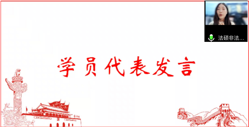 接着,本期学员代表法硕(非法学)预备党员王怡同学发言。她代表所有学员郑重承诺:将以最饱满的热情,最全面的投入,最实际的行动来完成这次培训班的学习任务。在党课学习期间,做到按时上课认真、严格要求、主动完善自身。