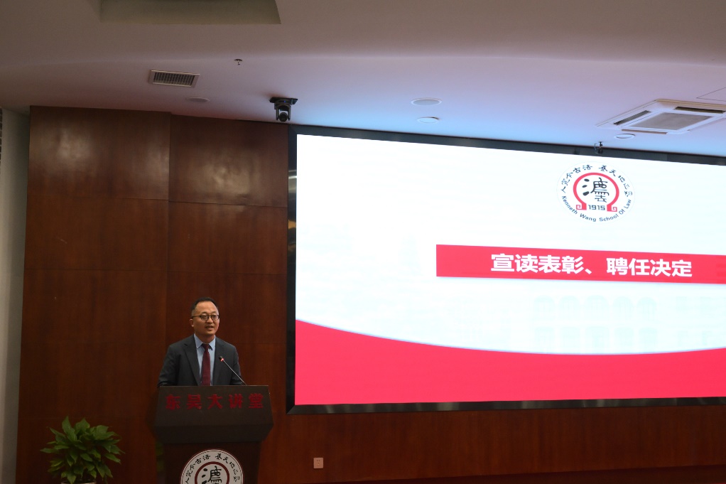 首先,王健法学院副院长程雪阳教授宣布学院2024年度“最受欢迎的老师”评选结果,宣读学院2023年度科研荣誉奖励决定,宣读2024级本科生班主任聘任决定,宣读2024级本科生“成长陪伴计划”导师聘任决定。