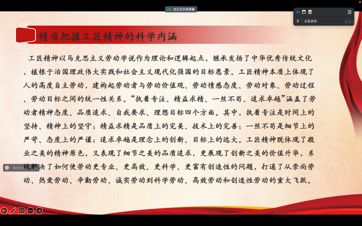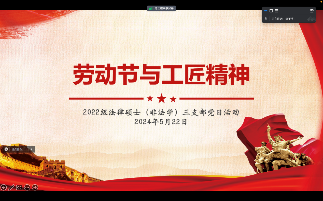人民创造历史,劳动开创未来。党的十八大以来,习近平总书记特别礼赞劳动创造,多次褒奖劳动模范和大国工匠,要求大力弘扬劳模精神、劳动精神、工匠精神。2024年5月22日,因专业实习原因,法硕非法学三支部通过线上方式,开展“弘扬工匠精神 激发奋进力量”主题党日活动,大力弘扬劳模精神、工匠精神。本次活动由法硕非法学第三支部书记李芊芊同志主持,支部28名党员共同参与。