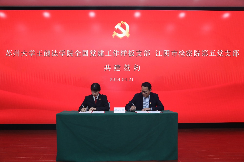 随后,苏州大学王健法学院本科生一支部书记单杰与江阴市人民检察院第五党支部书记方静签署支部共建协议。