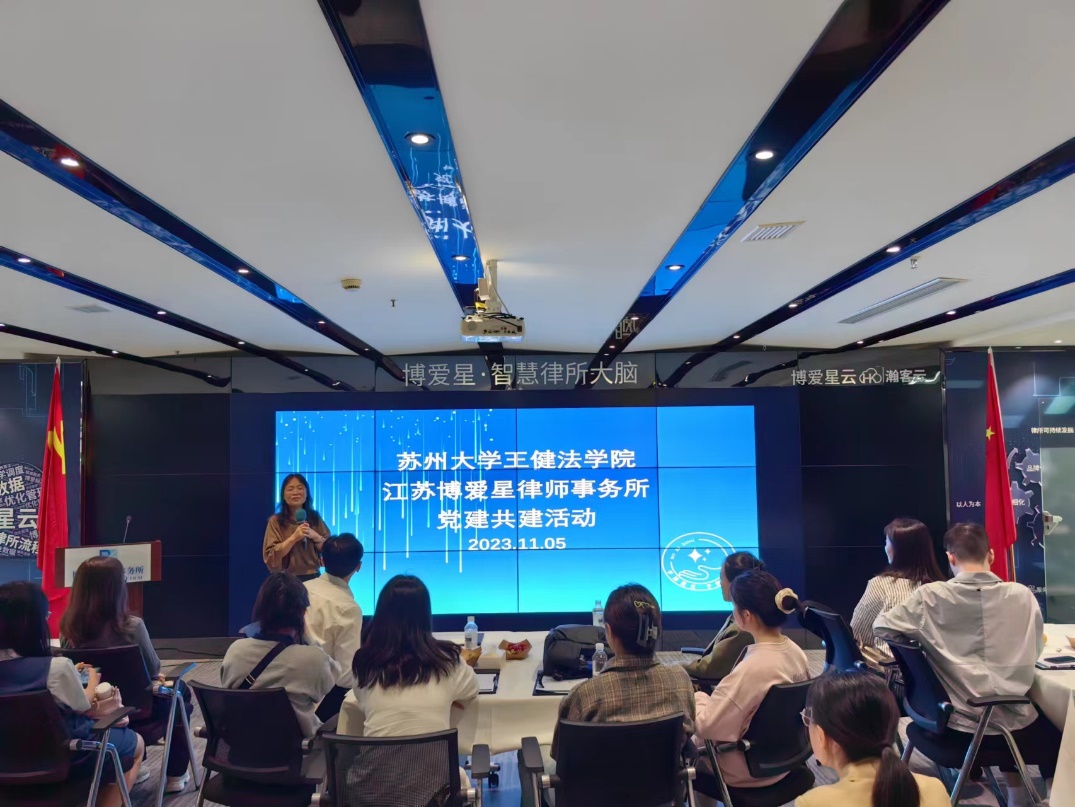 在苏州大学法学校友会副会长、我院99级优秀校友、律所合伙人张奇主任的带领下,师生党员一行参观了事务所的办公环境,了解了博爱星律师事务所的发展历程。张奇主任向我院师生介绍了博爱星律师事务所近年来在律所管理、品牌建设、党建工作和社会公益活动等方面的发展情况。律所始终坚持把共建共享作为加强新时代律所建设的重要举措,与地区各高校、企事业单位协同开展全面从严治党主题教育、公益普法主题教育等活动,探索形成品牌联创、平台联建、资源联享、活动联办、阵地共用的“四联一共”模式,以“星筑梦”“星建设”“星联盟”品牌,创建博爱星系列特色党建活动。王健法学院党委在学生样板支部建设方面的探索和成效也让博爱星律所党总支感受到了学生党建在人才培养方面的重要引领作用。学生党员与党员律师还进行了分组交流讨论,双方在党建引领立德树人、专业课程学习、职业生涯规划等方面进行深入探讨。同学们纷纷表示通过此次活动听到了很多前辈们的宝贵经验,对律师职业有了更多了解。