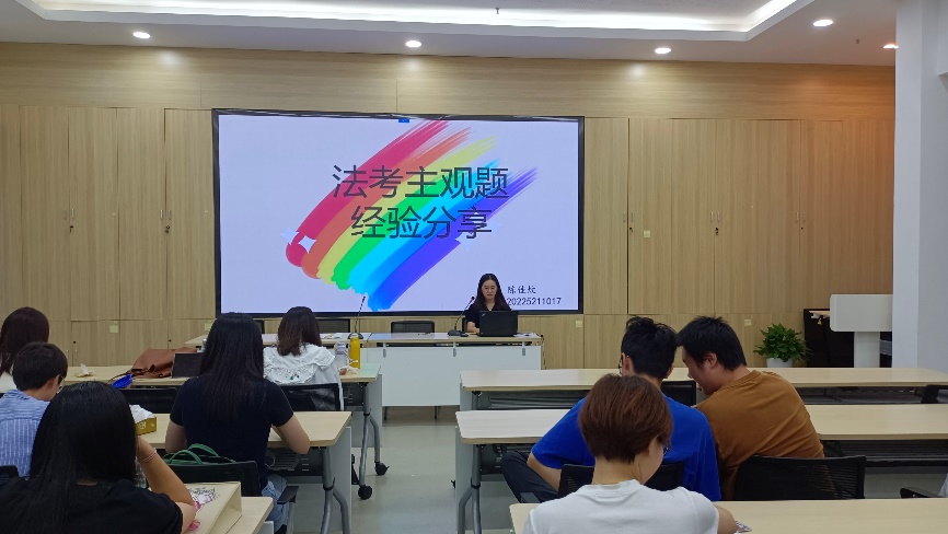 会议当中,查璇、朱娜和陈佳炆同学分别给大家分享了法考通关经验。查璇同学给大家介绍法考的报考流程以及注意事项,并鼓励大家:“成功的路上从不拥挤”。朱娜同学主要从备考书籍和备考老师推荐两方面分享法考客观题的备考经验,并真诚地祝福大家能通过法考。陈佳炆同学详细地给大家介绍法考主观题的备考经验,分享自己的各科学习方法,大家都受益匪浅。