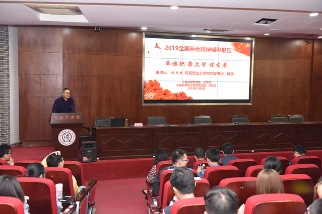 为认真学习贯彻2019年两会精神,加强对习近平新时代中国特色社会主义思想的深刻理解与把握,王健法学院党委、分党校联合光电科学与工程学院党委、分党校特邀马克思主义学院党委书记张才君教授为两院广大师生党员和入党积极分子作专题学习报告。5月8日下午2点,“举旗帜、聚众智、谋发展——学习2019年两会精神体会”报告会在王健法学院东吴大讲堂正式召开。