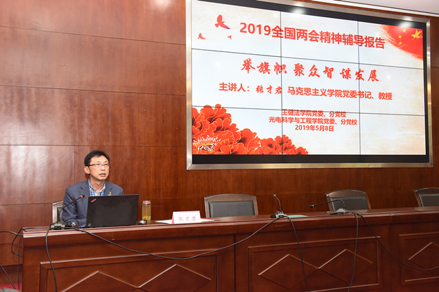 本次报告会由王健法学院党委书记周国华主持。光电科学与工程学院党委书记陈建军、党委副书记兼副院长龚呈卉,王健法学院副院长程雪阳、党委副书记兼副院长王振华、王健法学院、光电科学与工程学院的中心组成员、部分教师党员、全体学生党员及入党积极分子参加了本次报告会。