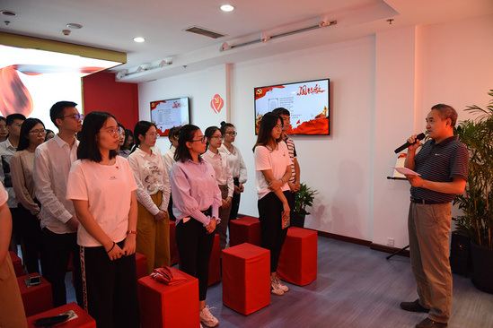 观影后,在胡洋老师的带领下,所有党员面向党旗庄严宣誓,眼神坚定而铿锵有力地念出誓词:我志愿加入中国共产党……….,永不叛党。本科生二支部章金同学作为宣誓党员代表发言。他表示,新时代的共产党员道阻且长,要坚持不忘初心,珍惜这个时代给我们创造的大好环境,铭记并传承东吴先辈们的信仰精神。章金同学还号召所有学生党员积极发挥党员责任担当,始终勇于走在前列,敢当模范先锋,为中华民族伟大复兴时刻准备着、行动着。