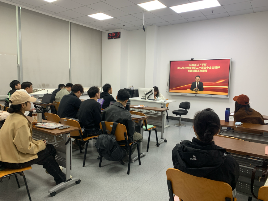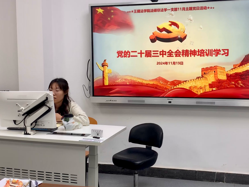 党的二十届三中全会吹响了进一步全面深化改革开辟中国式现代化广阔前景的时代号角。为了持续深入学习党的二十届三中全会精神,2024年11月19日,王健法学院法硕非法学一支部组织全体党员同志开展“党的二十届三中全会精神培训学习”十一月主题党日活动,活动由组织委员刘馨玥主持。