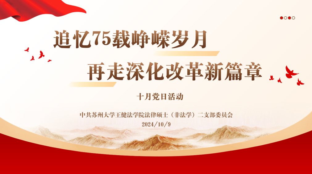 为深入学习贯彻党的二十届三中全会精神,全面学习习近平总书记在全国教育大会上的重要讲话精神,感受新中国成立七十五周年取得的新成就、新变化,2024年10月9日,苏州大学王健法学院法律硕士(非法学)研究生二支部于王健法学院A108教室召开了以“追忆七十五载峥嵘岁月,再走深化改革新篇章”为主题的党日学习教育活动,本次会议由党支部组织委员夏冬林主持,全体党员同志参加会议。