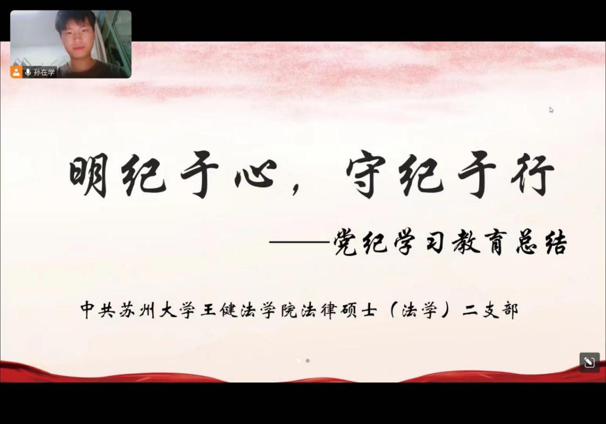 为深入学习贯彻习近平总书记关于党纪学习教育的重要讲话和重要指示精神,落实学校和机关党委有关党纪学习教育的部署要求,2024年9月22日,王健法学院法律硕士(法学)二支部以“明纪于心,守纪于行”为主题通过线上腾讯会议的方式开展党纪学习教育,全体党员参加。