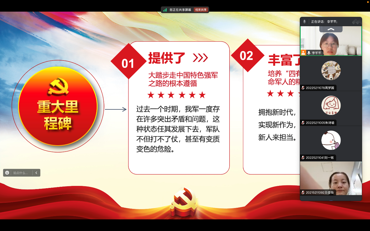 活动伊始,李芊芊同志介绍了如下内容。在新时代的征程中,一支传承红色基因、肩负神圣使命的人民军队以昂扬的姿态展现在世人面前。他们筑牢听党指挥的政治信念,坚守服务人民的根本宗旨,锤炼英勇顽强的战斗精神,严守令行禁止的纪律规矩,弘扬求真务实的优良作风,成为新时代国防建设的中流砥柱。传承红色基因,塑造时代革命军人,这是新时代赋予军队的神圣使命。