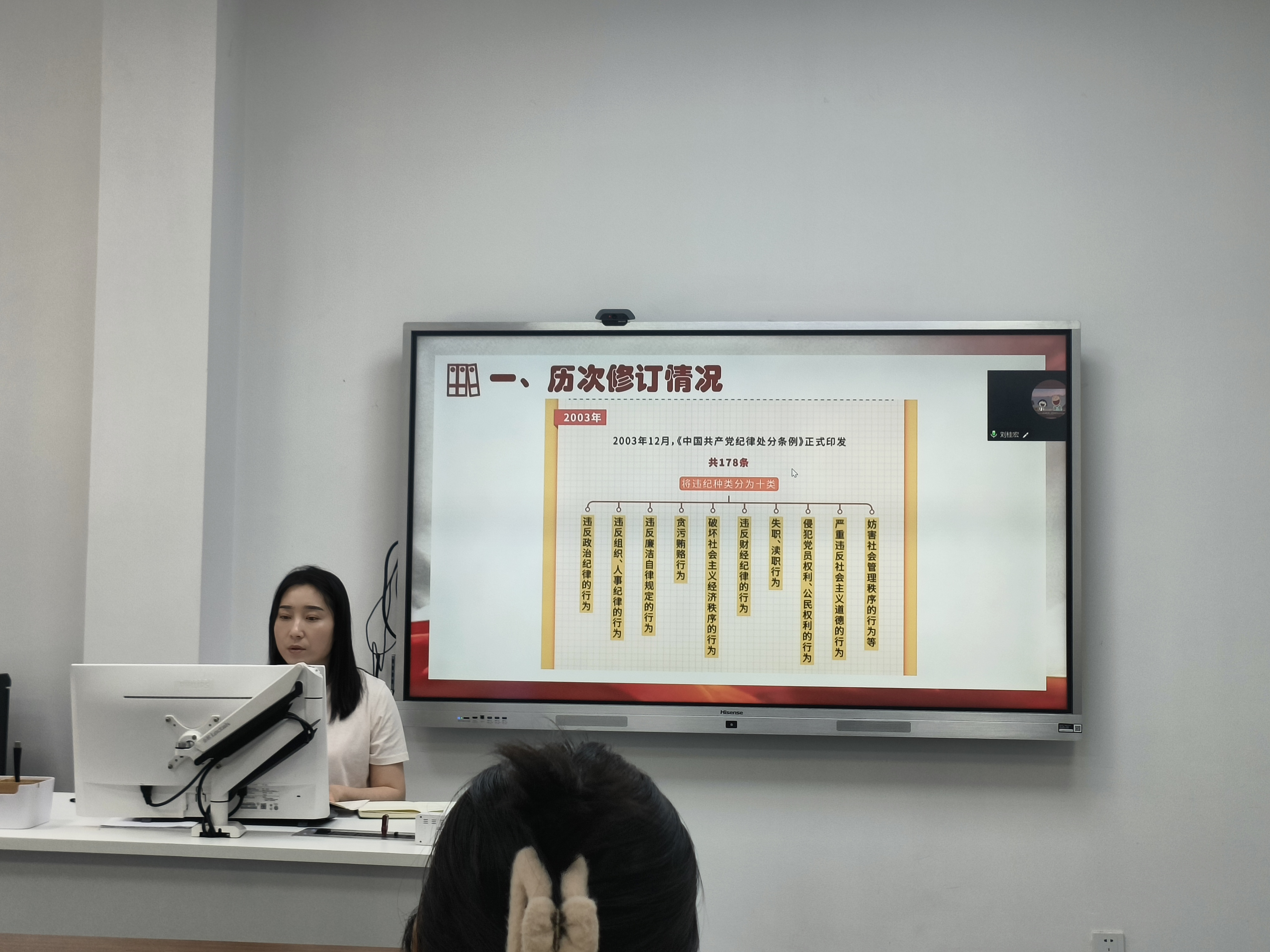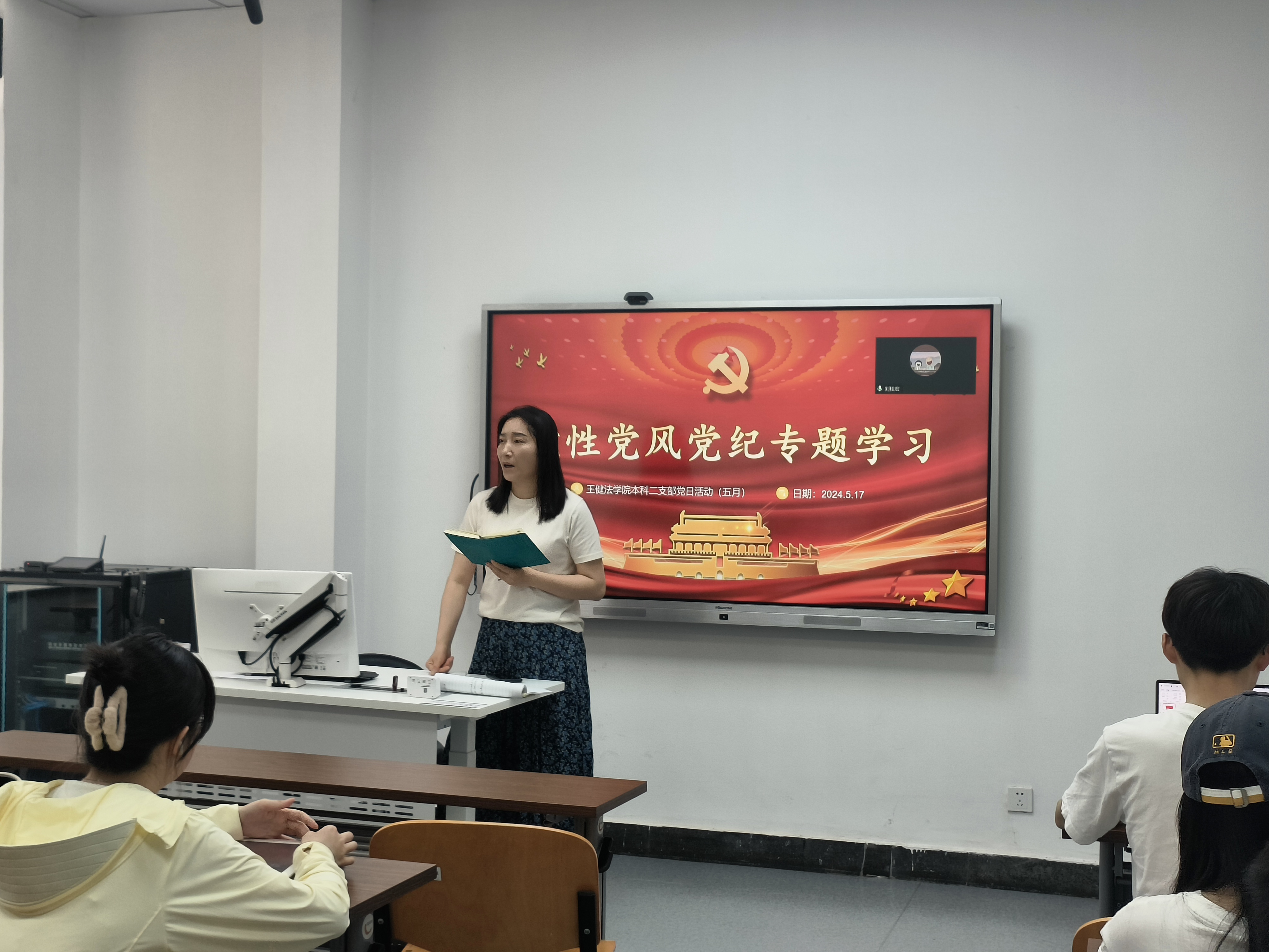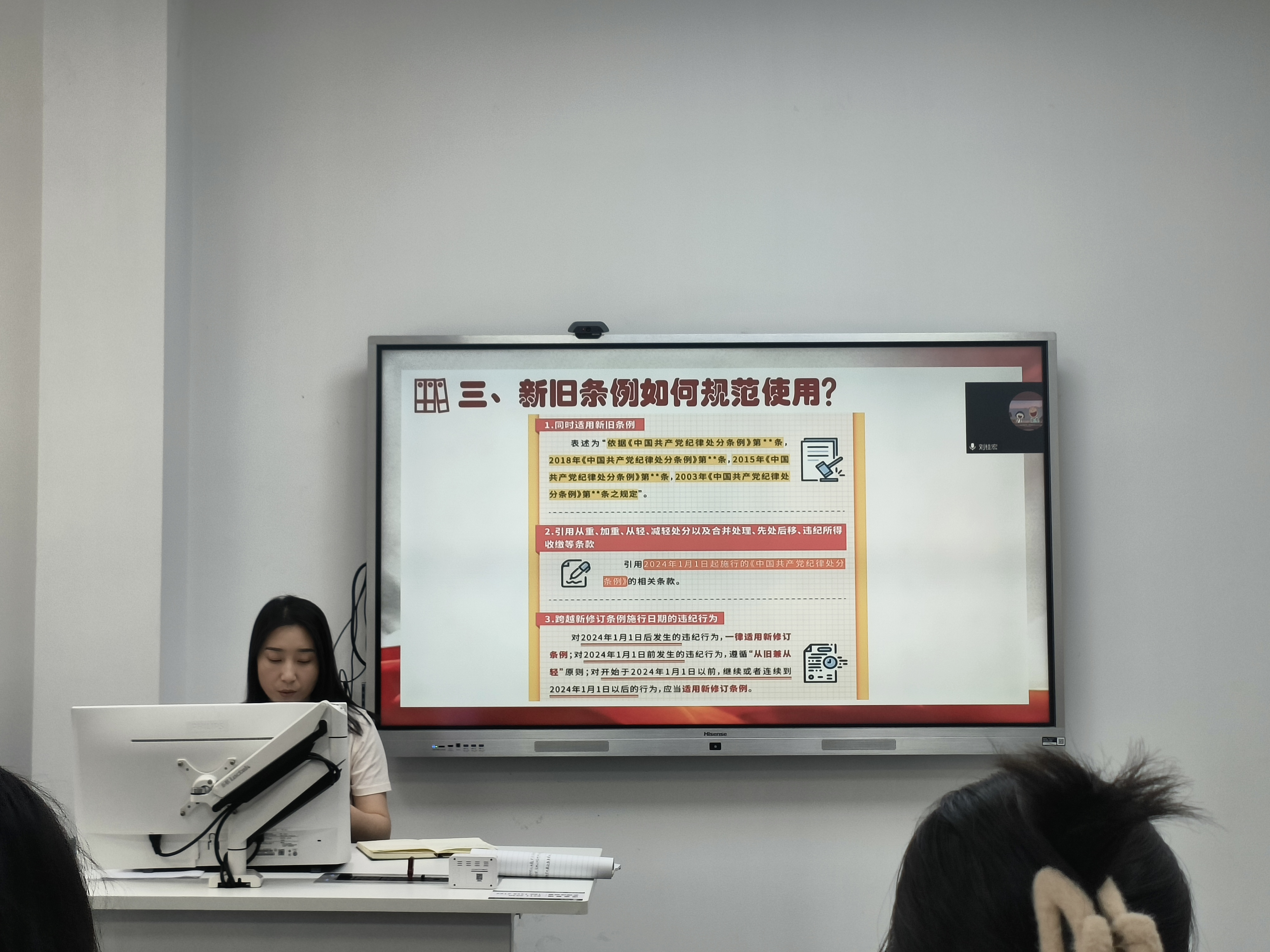 2024年5月17日,本科二支部党员在王健法学院A113教室开展了5月份的党日活动。面对各位青年党员即将进入社会的情况,支部书记刘桂宏老师聚焦《中国共产党纪律处分条例》,以幻灯片讲解、主题视频学习的方式,开展了一次严肃生动的廉洁纪律大学习。