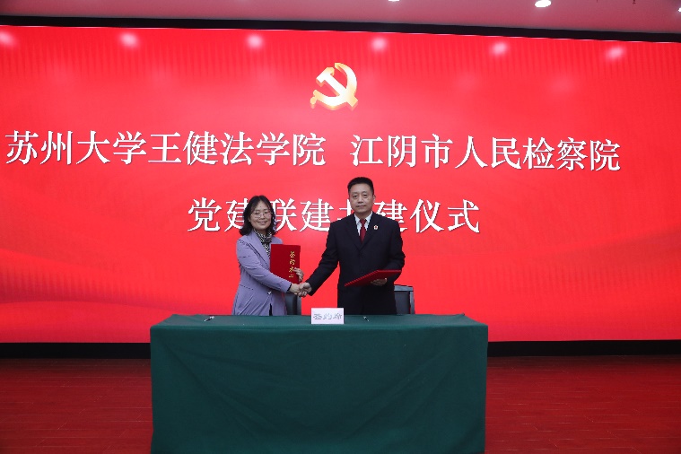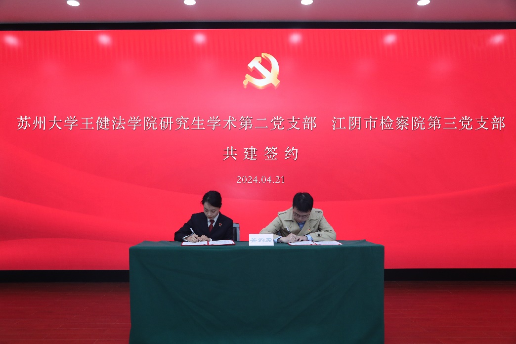 王健法学院全国党建工作样板支部本科生第一党支部、研究生学术第二党支部分别与江阴市人民检察院第五、第三党支部签订了党支部共建协议。