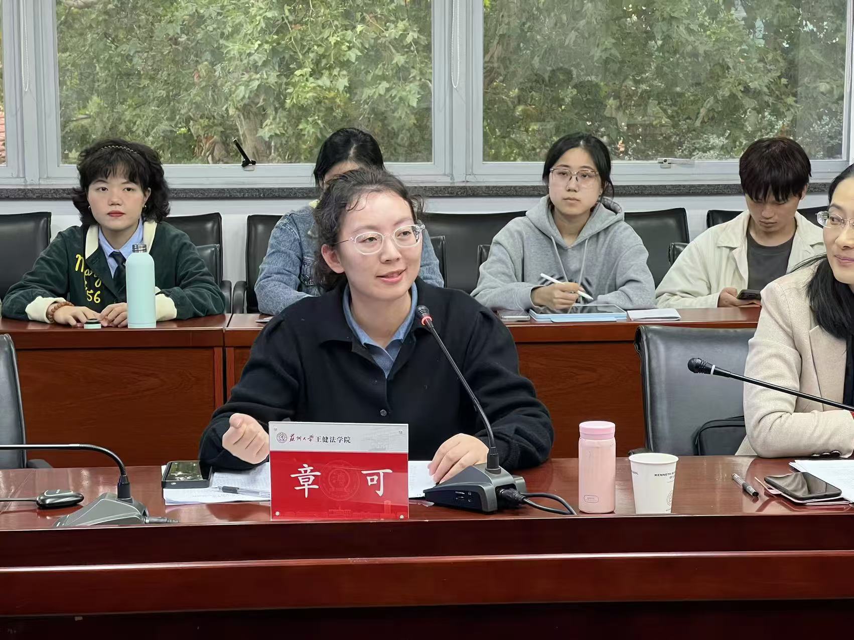 江苏省高院名校优生代表章可进行了发言。作为2024届的毕业生,她分享了自己在去年找工作时参与名校优生的心路历程,以自己的亲身事例引起了在场师生的共鸣。最后,她鼓励学弟学妹们不要畏惧困难,勇敢地去追寻自己的法学梦想。