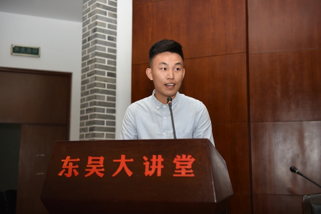 最后是2016级博士生代表法学理论的羊桦林同学发言。他首先提出的就是要怀揣一颗感恩的心,用感恩的心,勇往直前、攻坚克难。他也说要珍惜在苏大学习的每一天,因为学习如逆水行舟,不进则退。同时也要赶上时代变化的步伐,不断更新自己的思想。他还建议要做好吃苦的准备,虚心向老师同学请教。以此仰望星空,脚踏实地。