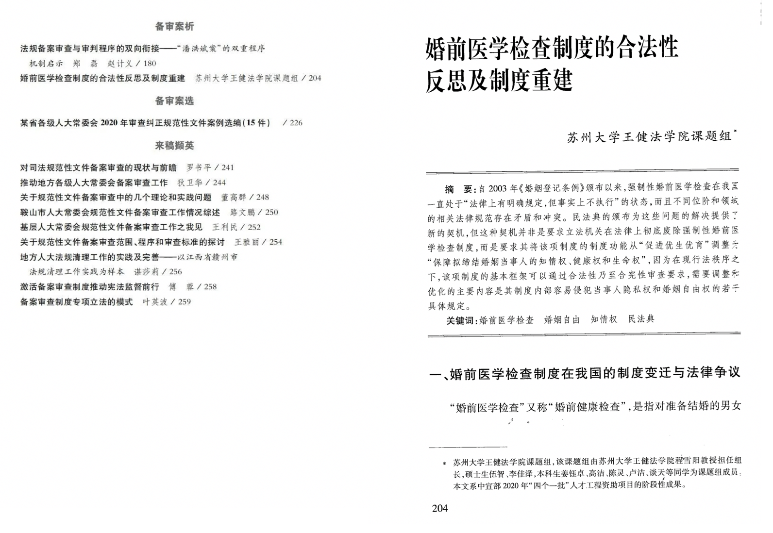 2022年1月4日,根据中国人民大学公法研究中心发布的公告,“苏大法学院课题组”所提出的“婚前医学检查相关法律法规备案审查建议”选入“2021年度中国十大宪法事例”。在1月4日下午举办的“2021年度中国十大宪法事例发布暨研讨会”上,中国人民大学王贵松教授,中国政法大学秦奥蕾教授和中南财经政法大学胡弘弘教授先后对该宪法事例进行了精彩点评。(参见2021年度中国十大宪法事例发布,https://mp.weixin.qq.com/s/pfN3_5wcol7T9yo8SJkdLw)