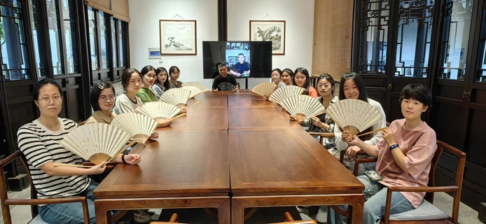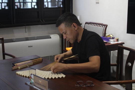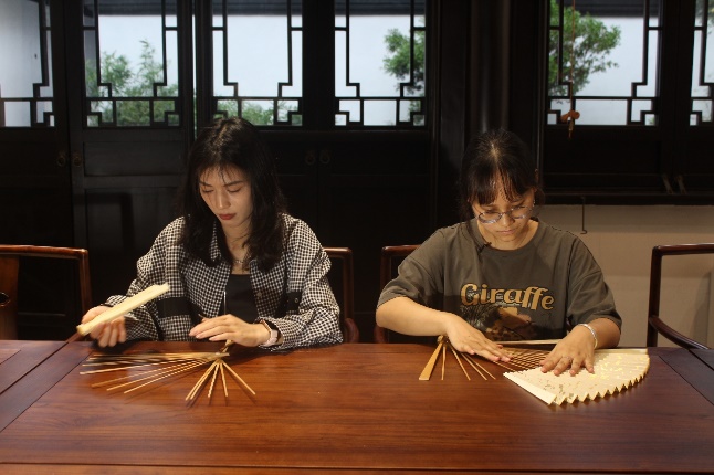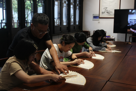 制扇技艺薪火相传,艺匠精神绵绵不绝。学员们在央视栏目组的安排之下,跟随国家级非遗代表性项目制扇技艺的代表性传承人徐家东老师体验苏扇的制作。徐家两代人均与“扇”结缘,徐家东先生,承继家学,在传承技艺的同时加以创新,使苏扇技艺有了新发展。他首先向大家介绍了苏扇的历史渊源,接着向学员说明了苏扇制作工艺。一次体验,叹几代坚守。学员们在尝试过程中屡屡受挫,不时发出“扇骨顺序穿错啦”“扇骨又溜出去了”的叹息,每当这时,徐家东老师就来到学员的身边,耐心地进行指导。他说:“从扇柄、扇框、扇面到包边,我的父亲曾认真地教导过我,而我将继续做好‘传帮带’工作,践行工匠精神、传承姑苏文脉,用实际行动展示好非遗之美。”最终,在徐家东老师的指导下,学员们都顺利完成了折扇制作的初体验,不仅了解了苏扇的制作技艺,更深刻体悟了制扇匠人“执着专注、精益求精、一丝不苟、追求卓越”的工匠精神。