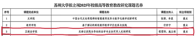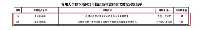 王俊教授与于润芝讲师合作的《数字化转型中法学专业的教学方法更新研究》、柯伟才副教授与栾兆星讲师合作的《法文化视野下高校法律史课程中西案例比较式教学方法研究》两项课题获苏州大学校级一般项目立项。
