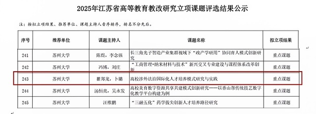 近日,2025年江苏省高等教育教改研究课题、苏州大学高等教育教改研究课题立项结果陆续公布,我院立项工作取得新突破。