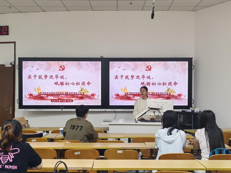 为深入学习贯彻习近平新时代中国特色社会主义思想,巩固拓展主题教育成果,激励支部党员铭记光辉历史、汲取奋进力量。2025年10月16日,学术型研究生第二党支部在王健法学院A107教室召开“实干筑梦迎华诞,砥砺初心担使命”主题党日活动。活动由党支部书记赵芸卉同志主持,支部全体党员参加。