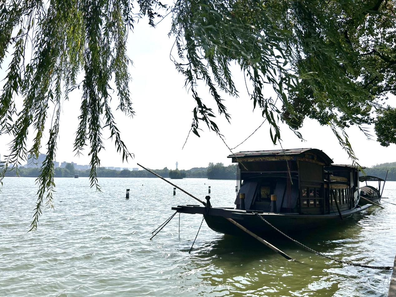 一湖烟波细无声,有幸见证百年史。如今,六十多年前制造的那条纪念红船,依然坚定地停泊在烟雨楼前东南方向的水面上,真实还原了1921年中共一大会议在南湖召开时的历史场景。船首向东,迎接着东升的旭日,象征着中国共产党代表光明,光景常新,永放光芒。