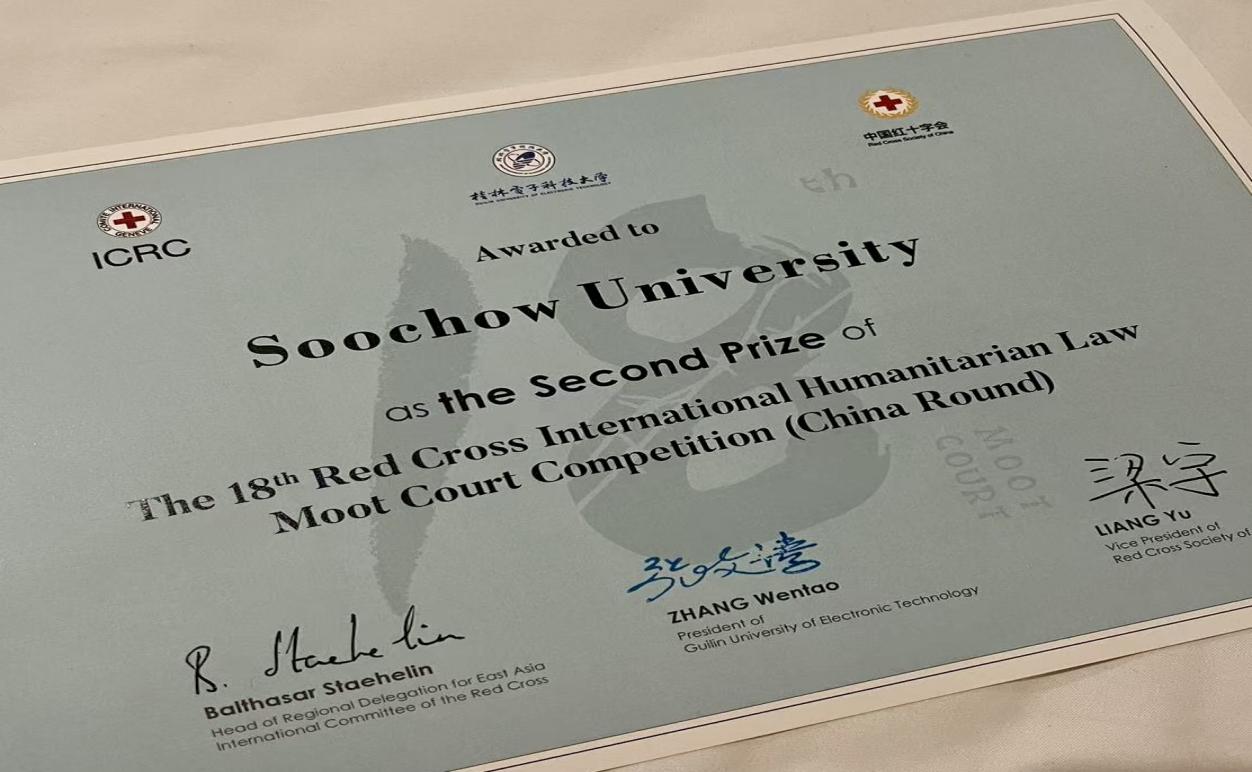 2024年11月22日至24日,由红十字国际委员会、中国国际人道法国家委员会秘书处、红十字国际学院和桂林电子科技大学共同主办的第十八届红十字国际人道法模拟法庭竞赛(中国赛)在桂林电子科技大学线下举行。我院学生代表队由国际法教研室卜璐老师带队,在两场积分赛的角逐中表现优秀,在参赛的六十七支队伍中脱颖而出,荣获本次大赛二等奖。