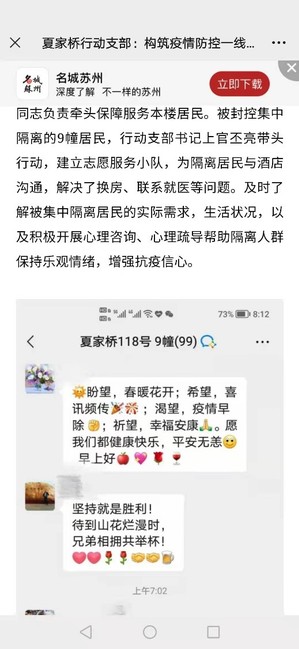 志愿服务小队在隔离酒店,按照隔离规定是一人一个房间,虽不能出门更不能串门,但上官院长和其他各位志愿者通过微信和电话,积极与隔离酒店点长、经理、工作组工作人员联系沟通督促;协助身体不好的居民更换房间、联系就医、更换和添加房间设施和生活用品、改进伙食;帮助咨询并解答隔离居民提出的一些问题,传播传疫情防控知识;引进园区教育局“暖融融”志愿者团队加入隔离居民群并开展特殊关爱帮扶和心理疏导活动;鼓励和引导居民保持良好心态、安心隔离、配合观察。他们的工作受到隔离居民们的一致好评。媒体也对夏家桥9幢疫情防控志愿服务小队也进行了相关报道。
