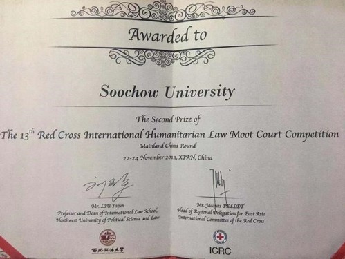 2019年11月,由红十字国际委员会与西北政法大学联合主办的第十三届中国大陆地区红十字国际人道法模拟法庭竞赛在西北政法大学举行。我院代表队在两场积分赛的角逐中表现优秀,凭借稳定的现场发挥和优异的书状分数,在三十九支参赛队伍中脱颖而出,荣获本次大赛二等奖。