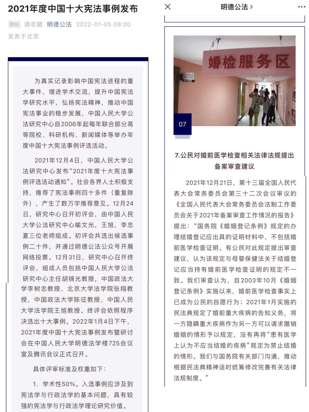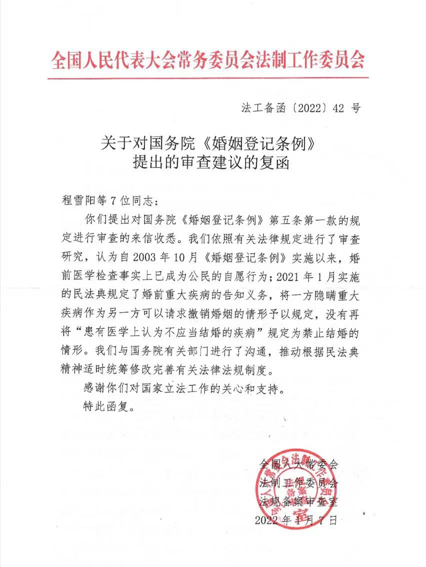 (1)2021年向全国人大常委会法工委提出的《关于对<婚姻登记条例>第5条进行备案审查的建议》获全国人大常务委员会法工委采纳,并被纳入全国人大常委会《2021年备案审查工作报告》;