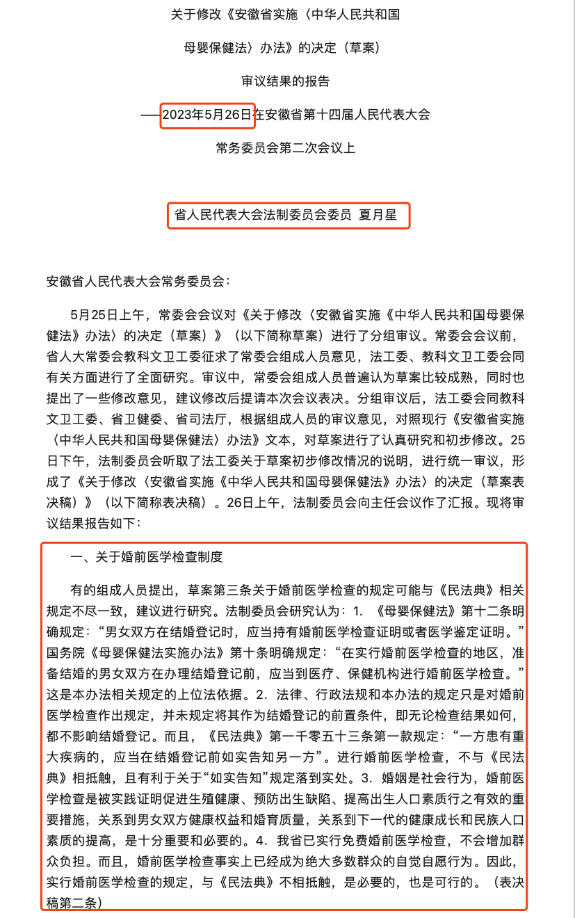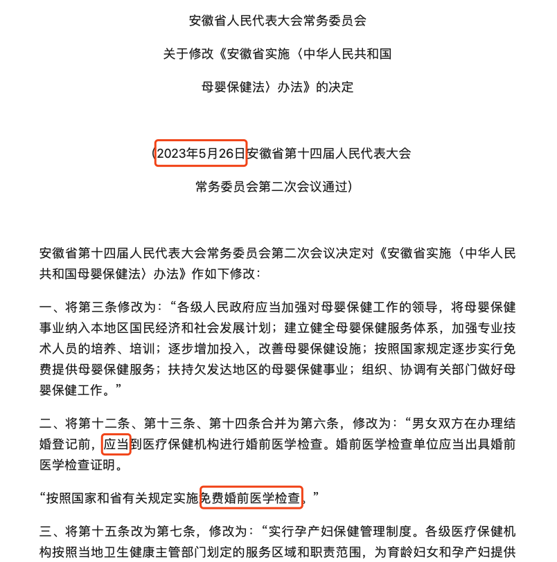 (3)近年来,多位全国人大代表依据课题组形成的研究成果提交了全国两会议案,安徽省人大常委会2023年5月26日通过的《关于修改<安徽省实施<中华人民共和国母婴保健法>办法>的决定》也与该团队形成的研究成果高度一致。