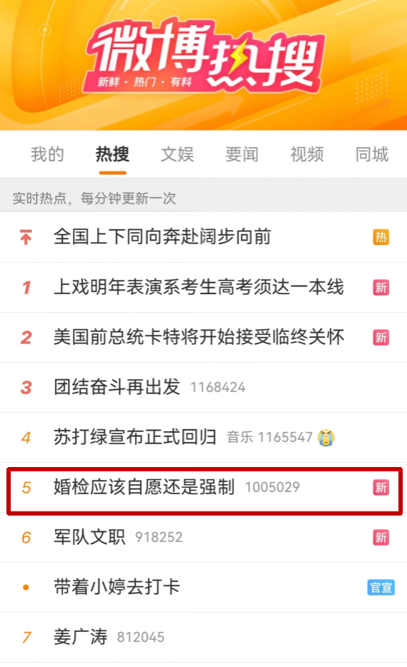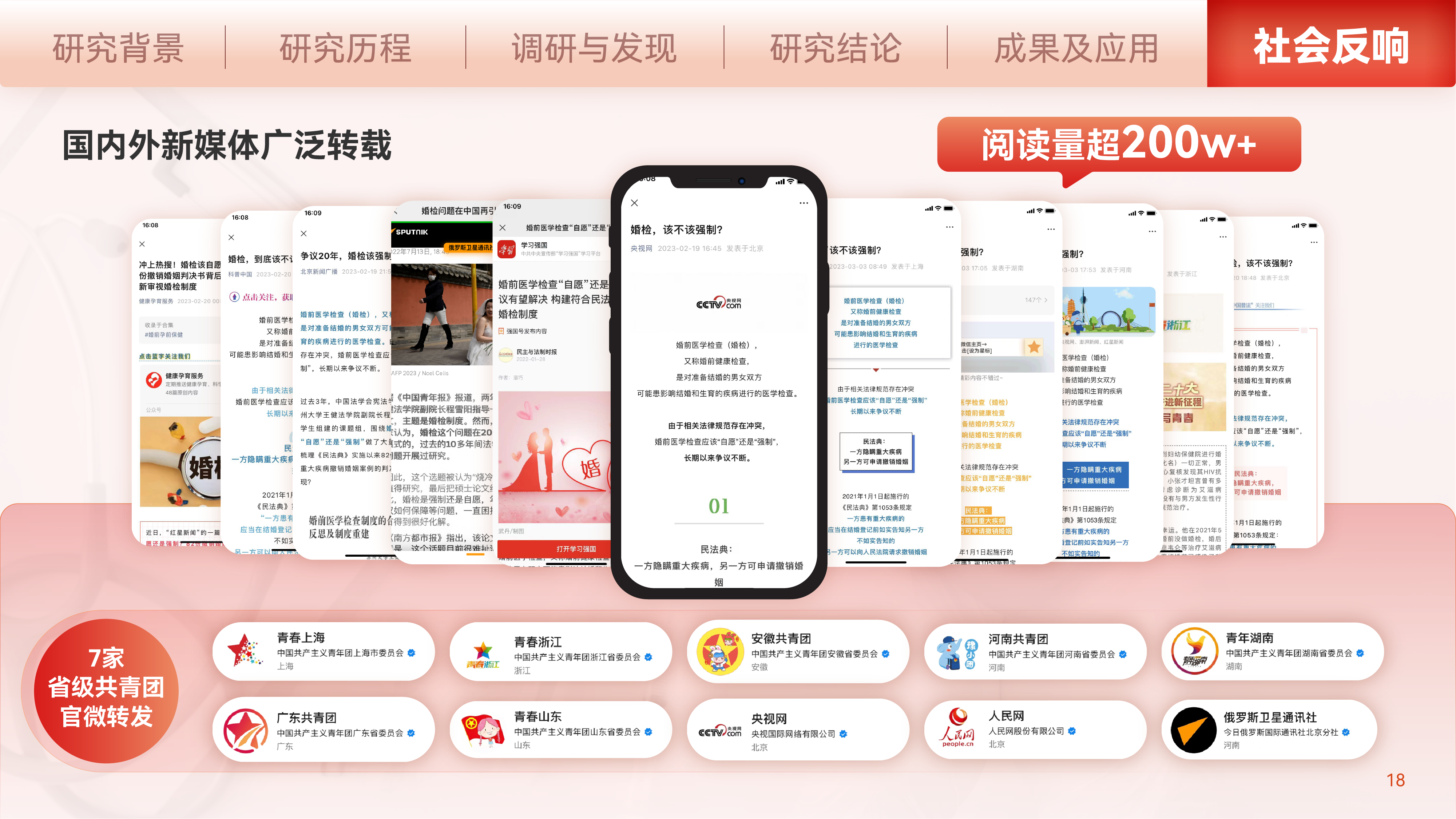 在媒体报道层面,该团队形成的相关研究成果在2022-2023年间,持续得到南方都市报、中国青年报、民主与法制时报、红星新闻、俄罗斯卫星通讯社等国内外权威媒体广泛专题报道。特别是红星新闻2023年2月18日专题报道该团队对82份典型司法判决的案例分析结果后,经过CCTV、中国普法、科普中国等媒体转载,“婚检应当强制还是自愿”话题隔日冲上微博热搜第五,最终话题总量高达1.2亿次。
