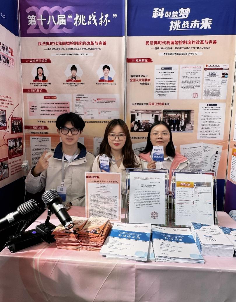 在本届“挑战杯”竞赛中,我院硕士研究生姜钰卓、孙雯,本科生邹澄蔚组成“苏大婚检研究团队”, 在我院副院长、教育部青年长江学者程雪阳教授指导下,经过层层选拔,入围国赛终审现场,荣获主体赛国赛一等奖,取得了王健法学院在挑战杯中获得的最好成绩,实现了历史性的重大突破!