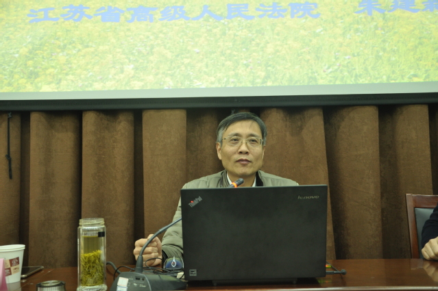 讲座在王教授的介绍后正式开始。朱庭长本次讲座的重点是关于贯彻《行政诉讼法司法解释》的若干问题,首先,他向我们介绍了《行诉解释》的几点制度创新,比如,明确了民事争议的适用范围;明确行政机关工作人员出庭范围;兼顾客观真实和程序公正,尤其是非法证据的排除规则等等。他指出,这一次的创新,产生了深远而重要的影响,既整合了原来的司法解释,也借鉴了民诉法的司法解释。接着,他向我们介绍了对于《行诉解释》的贯彻情况。第一是熟悉条文,做到了有一个本质、系统的理解;第二是组织专题培训,以便对条款的理解更好的统一到最高法院的要求、权威的意见;第三是围绕事务中的疑难问题做了专题调研,各个市分配不同的主题,相互交流共享,推动条例的学习和把握;第四是争取在审判过程中,将该解释运用到案件审理中去。