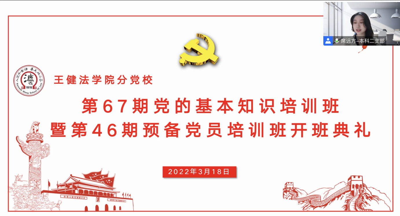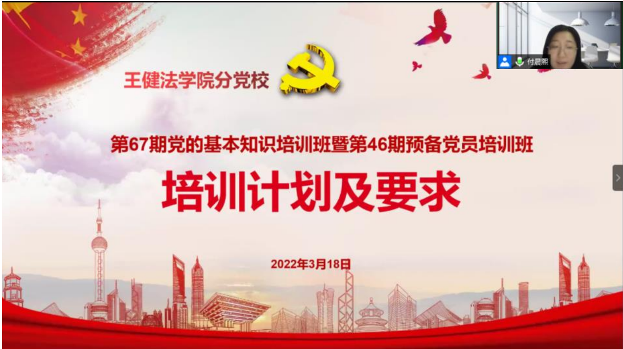 3月18日晚,王健法学院分党校第67期党的基本知识培训班暨第46期预备党员培训班开班典礼暨第一次党课在腾讯会议平台顺利举行。王健法学院党委书记、分党校校长孙宁华老师,学院党委副书记、分党校副校长朱春霞老师,学院学生工作办公室副主任张焕然老师,研究生辅导员付晨熙老师出席,学院学生党务中心席远方同学主持,全体学员参加会议。